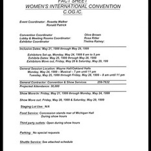 Planning documents for the upcoming 49th Annual Women’s International Convention, Church of God in Christ, Detroit, Michigan, 1999 May 21-29. [Description English/roman)]