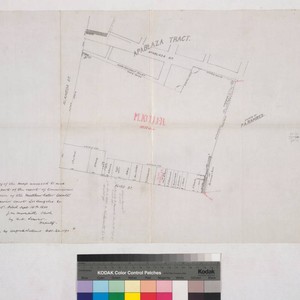 Keller's 9.252 acres bordered by Alameda St., Aliso St. and estate of P.A. Ramires; showing parcel owners along Aliso Street, Marchessault Alley, Apablaza St & Tract; structures (Chinese Theatre); courses, distances Copy made by Alfred Solano, Sept. 22, 1890. Title supplied by cataloger.