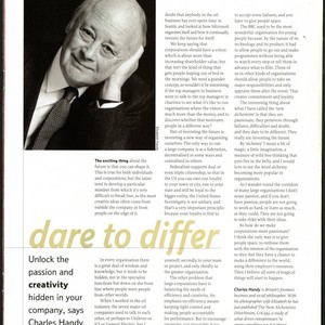 Article by Charles Handy on what businesses should do to encourage creativity and passion. Handy suggests corporations be decentralized and run as federations, and employees given space to try new things, 1999; Charles Handy Papers; Box 15, Folder 4; 1 page