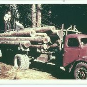 Photo, color: Warren Welsh piling a load of redwoods on Reo truck going to Bay Area.