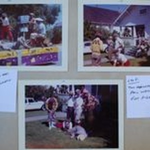 Photo--color: Four Sebastopol Lions Club scrapbook photos of their float for an Apple Blossom parade, about 1960s. top L: red pants, Phil Wetch, cameraman, Sam Leighy, Big Hat seated Jack St. Martin, man down, Jack Fore.