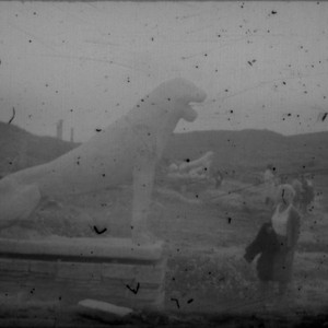 Image / Unidentified woman standing next to lion sculpture