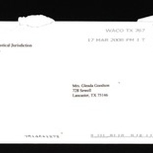 Freddye Carter, 317 Hood Street, Waco, Texas (Church of God in Christ, Texas northeast jurisdiction, Department of Women), letter, 2008 March 15, to Glenda Goodson, 728 Sewell, Lancaster, Texas & Church of God in Christ "executive committee, boards, district missionaries, auxiliary and unit leaders". Includes envelope. [Description English/roman)]