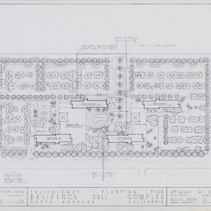 This is a preliminary planting plan for the area surrounding the private residence hall, Francisco Torres. This residence hall, at the corner of Storke Road and El Colegio, was built and maintained by private owners. Though it was heavily marketed towards incoming freshman, it was not part of the UCSB Housing department until UCSB purchased the complex in 2003 and renamed it Santa Catalina.