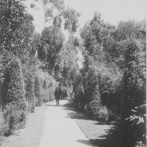 View of the San Marino grounds with Mr. Huntington walking on a path lined with trees and shrubbery. He holds his cane in his right hand, but does not use it. MS note on verso reading "Huntington Library. Path to office & Mr. Huntington, about 1918, path between house and office where library is now." Another copy is no. 155 Pictures Archives, box 2, folder 2.
