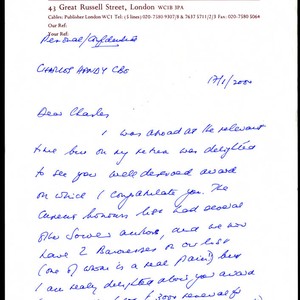 Letter of congratulations to Charles Handy for his CBE. The writer states that Handy's award is well-deserved. He/she then reveals that several other notables were recognized, as well, and closes the letter with all good wishes to Handy.