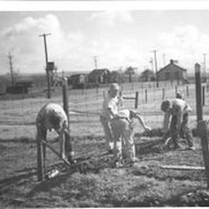 Photo--black and white: Unidentified photo of the Rosebrook and Whitham family of Windsor and Sebastopol. Four young boys and an adult male are digging in a fenced area, possibly Windsor. Houses and a water tower are seen in background. Circa 1950s