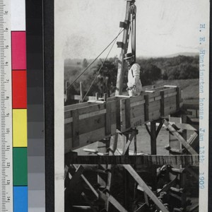 View of a workman in a wooden trough facing the camera. Typed note on side reads "H.E. Huntington house, Jan. 13th, 1909."
