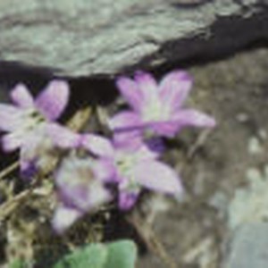 Purple flowers with white middles standing near gray rock at Cape Perpetua.