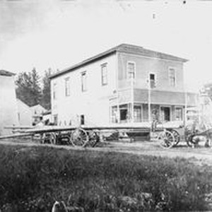 Photo--black and white: Early photo of Electric Hotel (Johnston Hotel) in Forestville owned by Clifford and J.P. McConnell. Note no overhang over he veranda and painter and ladder on front porch. Horses in harness pulling a dray delivering power poles with driver seated on poles. Windmill to far right.