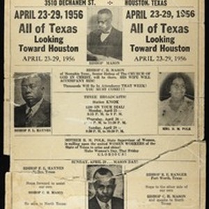 Flier for the Texas state convocation of the Church of God in Christ, 3510 Dechanem Street, Houston, Texas, 1956 April 23-29. [Description English/roman)]