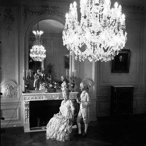 A couple can be seen reflected in the mirror. On the wall to the right of the mirror is Joseph Wright of Derby's Young man with cap and gown (circa 1760). The clock on the mantel is stamped Japy Frères et Cie and is from 1785 or later. Label accompanying photograph in album reads "HEH 38 Drawing room, Huntington Art Gallery, with figures."