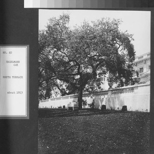A large oak tree shades a bench just south of the south terrace of the residence. The label that accompanies this photo in the album reads "No. 82 Engelmann oak, south terrace, about 1913."