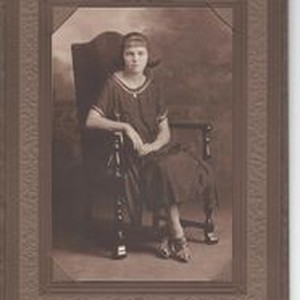 Photo--sepia, studio matted: Photo portrait of Ethel M. Sharp as a teenager, about 1920. . Ethel is the younger sister of Clifford, Gertie and Lester Sharp and child of Mr. & Mrs. Earl Sharp. Nelson Studio, Santa Rosa, Ca