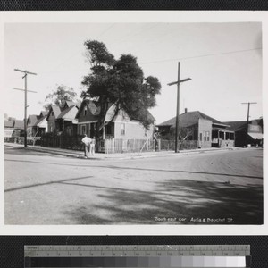 View of houses with fenced-in yards and trees, as well as two boys standing at center and a business at the far right viewed from the corner of Avila Street and Bauchet Street near Old Chinatown in Los Angeles. Title transcribed from photograph. Two copies of this photograph. This copy is less exposed and is lacking the encircled 43.