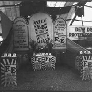 Photo--black and white: Gravenstein Apple Show display, about 1930s of Frizelle, Eales & Co. poultry and feed store in Cotati--Hessel and Sebastopol. The display shows the striped sacks of the F and E brand feed, egg mash, hen scratch, lacto milk starting mash, etc.