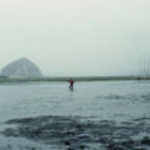 Morro Rock with students in mud flats in foreground and power plant in background.
