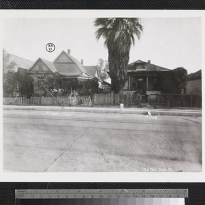 View of houses with fenced-in yards and large palm tree on Date Street near Old Chinatown, Los Angeles.
