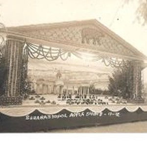 Postcard, black and white: A 1912 Gravenstein Apple Show exhibit of a decorated stage with classical style buildings in the background and apples and glasses in foreground.