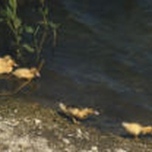 Four yellow duck chicks swimming into Atascadero Lake.