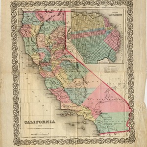 This is a map of CA in the 1850's. It shows many of the cities and towns as well as the railroad lines in California in that period. This map shows how many of the early cities and towns of California were situated along the rail lines, which helped make them, and eventually led to the decline of some as the rail lines started disappearing. Good condition (paper is fragile). Includes one inset map of San Francisco. Full document scanned.