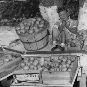 Photo--Black and white: Eileen Zimpher (Keyser) with apples 1957 or 1958. The Zimpher fruit stand was open from 1953 to 1980 on Gravenstein Highway near where Mary's Pizza is now (2010).