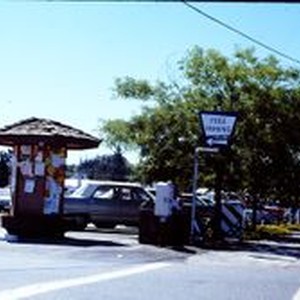 Slide, color transparency; The parking lot in Sebastopol at S. Main and Burnett Street. The Hogan Schoch & Assoc. (Powerhouse) building is seen in the left background. A message kiosk stands at the entrance.
