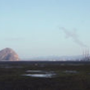 Mud flats in foreground with power plant and Morro Rock in background.