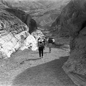 Negative shows a class walking through a canyon in Death Valley. Scanned with Epson Perfection V700 Photo as 1200 dpi TIFF image in 8 bit grayscale.