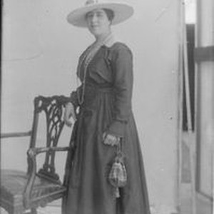 Negative glass-plate photo: From a glass plate negative made by William Borba. Photo portrait of a woman, standing next to a chair. She is wearing a long dress, with jewelry and a large hat.