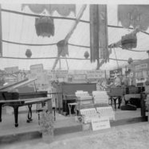 Photo--black and white, Gravenstein Apple Show circa 1930. Display of pianos and accordians with sign "Free Lessons W. S. Borba." Other display seen in background, H. B. Scudder, Real Estate, Emulsifine Spray Oils, Frizelle, Enos & Co., Baldwin.