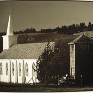 Photo--black and white: St. Teresa Church in the town of Bodega seen from the rear in 1976. Photographer Ron Chamberlain.