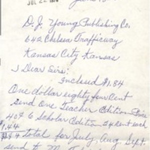 Fletcher M. Smith, letter, 1970 June 18, to D.J. Young Publishing Company requesting Sunday School Literature. [Description English/roman)]