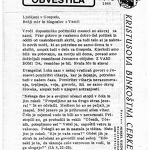 Bilten Kristove pentekostalne crkve u Ljubljani. Broj iz svibnja 1988. godine koji sadrži kratak uvodnik, a zatim izvješća o tome što se događalo u crkvi tijekom travnja i obavijesti o tome što će se događati u crkvi tijekom razdoblja od svibnja do kolovoza. [Description (original non-English/roman language/script)] Bulletin of the Christ's Pentecostal Church in Ljubljana for May to August, 1988, containing an editorial, report on what went on in the church during April and the notices what will be been happening in the church from May to August. [Description English/roman)]