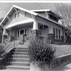 Photo, black and white: Sebastopol house at 7202 Bodega Avenue a Craftsman bungalow built in 1910 in the Morris Addition. House photographed in 1993 by Evelyn McClure for her book "Sebastopol, California : History, Homes and People."