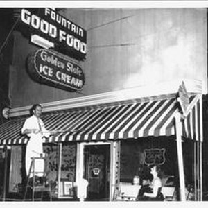 Photo--black and white: The Pine Cone Restaurant in Sebastopol circa 1950s or 1960s. A waiter is brushing off the awning and talking to a woman on the street. Signs advertise: "Golden State Ice Cream" "Fountain Good Food."