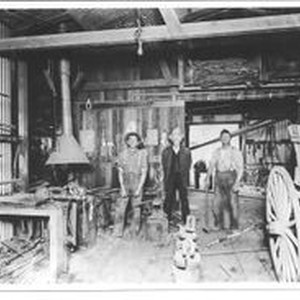 Photo--black and white: Sebastopol businesses. Interior of Berry's Livery Stable. Three men stand inside, two appear to be workmen and the center man may be the owner. A wagon on the right is being worked on and numerous tools are seen around the store. Circa 1880s