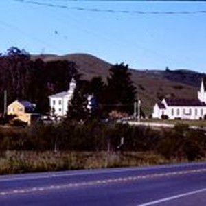 Slide, color transparency: The village of Bodega 1991. St. Teresa's Catholic Church to the right. Potter school in the center and the Wooden Duck Antique's the tan building to the left. Seen from Highway 12.