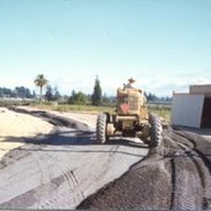Photo--color: Don Hallberg grading the road in front of the Hallberg Apple stand along Gravenstein Highway North (Highway 116).
