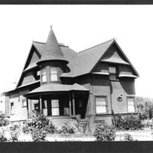 Photo--black and white: Queen Anne Shingle house known as the Baxter House at 876 Gravenstein Highway South. Built in 1892 by George Baxter president of the Bank of Sebastopol (later becoming the First National Bank of Sebastopol and eventually merging into the Bank of America). The house was later known as the Malm House, owned by local dentist Cuthbert E. Malm. Harvey Henningson Color Photography 910 Grav Hwy No. Sebastopol.