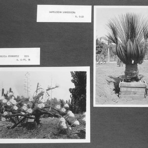 Two photographs of the desert garden mounted on a black page, labeled "Harrisia jusbertii 1931, N. C-77, 78" and "Dasylirion longissima, N. C-22."