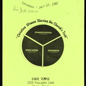 Annual women's day program, "Christian women sharing the church's task", Texas southwest, Church of God in Christ, State Temple, Waco, Texas, 1982 July 17. [Description English/roman)]