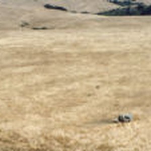 Dark green trees stand out against the dry brown grass on the rolling hills.