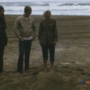 Students stand over a fellow student they buried in the sand. Students listed: Jim Arnold, John Tarr, Oscar Gonzales, Kathy Morrill, Pat Detmers, and Mike Carroll.