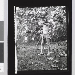Ernest Darling picks breadfruit from a tree. Title and date transcribed from envelope. Copy print of original. Ernest Darling inspired Jack London's story "The Nature Man."