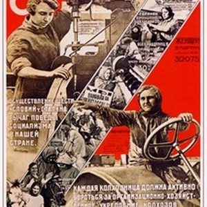 A poster dedicated to the International Women's Day on March the 8th. Captions reads, "8 marta -- boevoi prazdnik trudiashchikhsia zhenshchin vsego mira. osushchestvlenie shesti uslovii t.Stalina -- rychag pobedy sotsializma v nashi strane. Kazhdaia kolkhoznica dolzhna aktivno borot'sia za organizatsionno-khoziaistvennoe ukreplenie kolkhozov / 8 марта -- боевой праздник трудящихся женщин всего мира. Осуществление шести условий т.Сталина -- рычаг победы социализма в нашей стране. Каждая колхозница должна активно бороться за организационно-хозяйственное укрепление колхозов", meaning, "March the 8th is a great holiday for all working women all over the world. Fulfilling the six clauses of comrade Stalin is the way to achieve the victory of socialism in our country. Every female collective farmer must actively struggle for the administrative improvement of kolkhozes". [Description English/roman)]