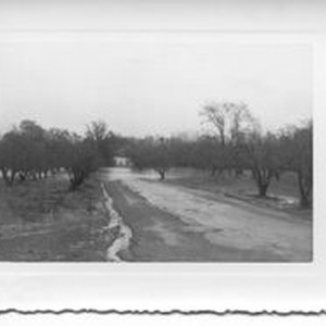 Print--black and white: 1951 flood in the Sebastopol Laguna area. Floodwaters cover an orchard.