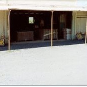Photo--color: Don and Marcia Hallberg's Fruit Stand 1975 on Gravenstein Highway North. The stand was made from an old garage. Don and his daughter Donna built the door to the stand. The Hallbergs sold apple products at their stand. Apple juice and apples are seen in the front of the building.