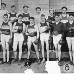 Photo--black and white: Analy Union High School boxing team of 1920. Glenn Winkler on left was Analy's heavyweight champion. Note the team's mascot bottom center.
