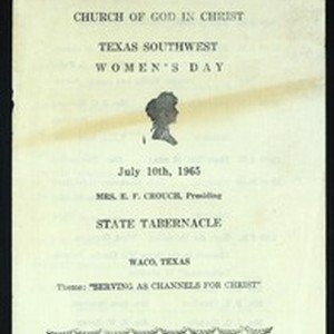 Women's day program, "Serving as channels for Christ", State Tabernacle, Church of God in Christ, Waco, Texas, 1965 July 10. [Description English/roman)]